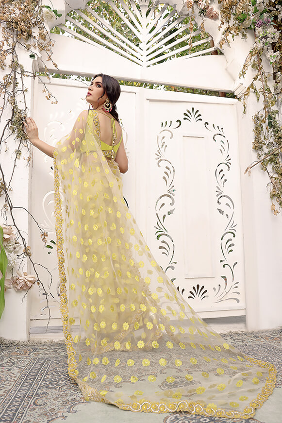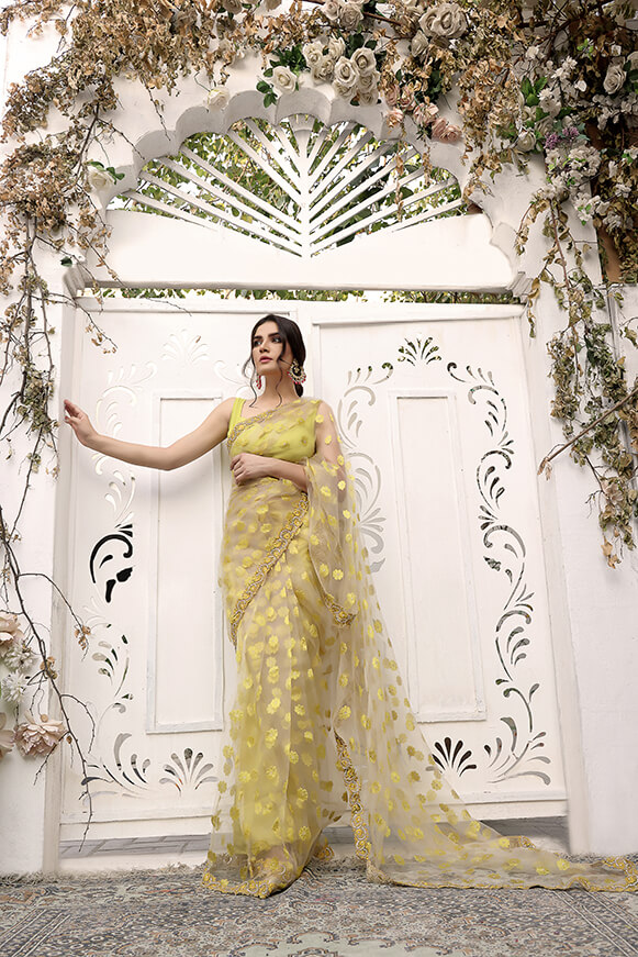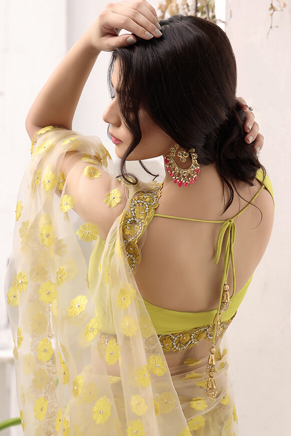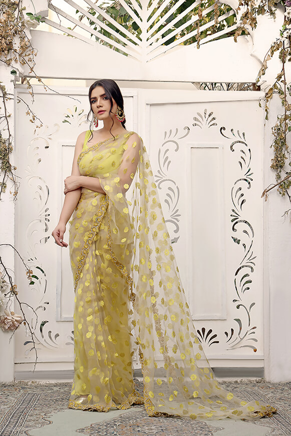 Floral embroidered organza saree with handwork all sides paired with silk blouse and silk paty coat.