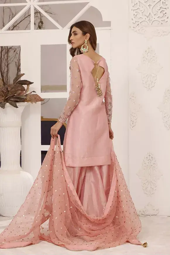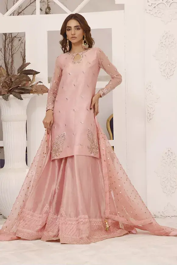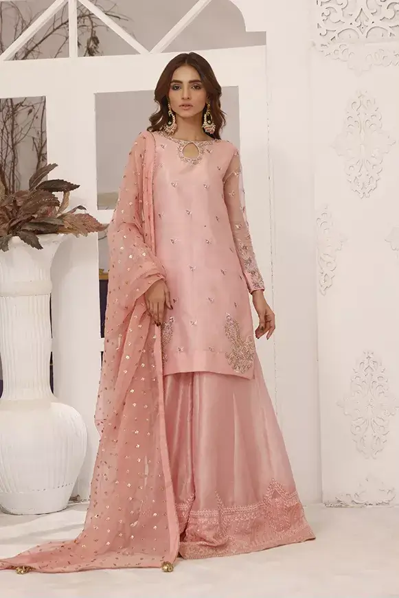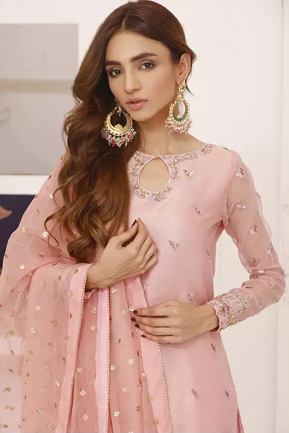 Shirt and Ghara pants curated on Lame with complete hand crafted work following the intricate details. This outfit comes in 3-piece, provided with pure organza hand sequenced (chhan) dupatta, to compliment its elegance.