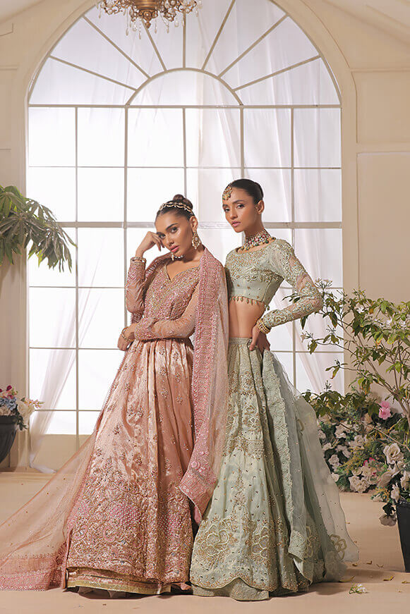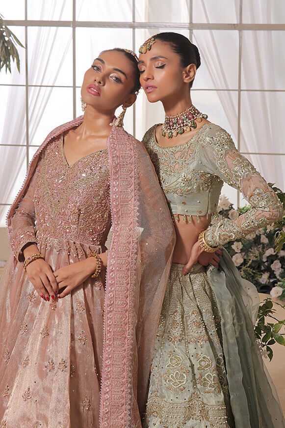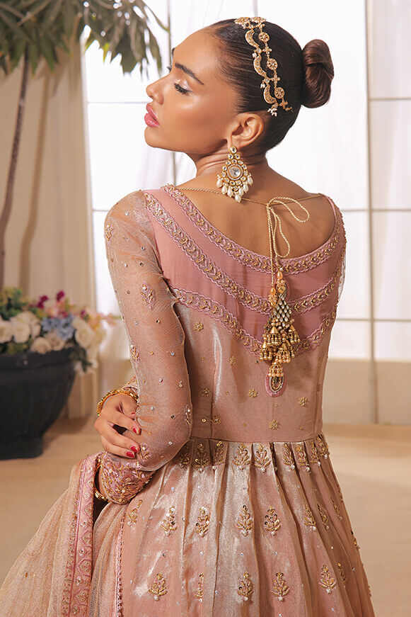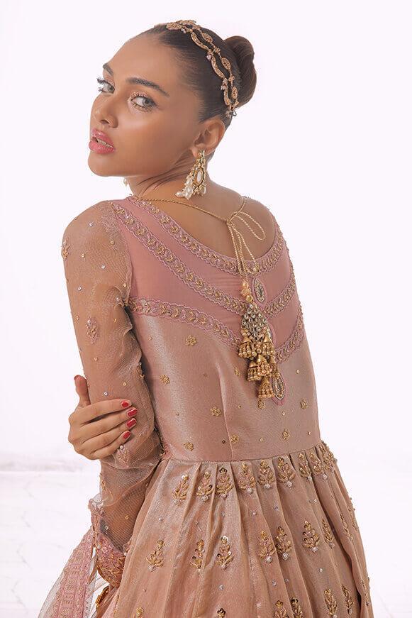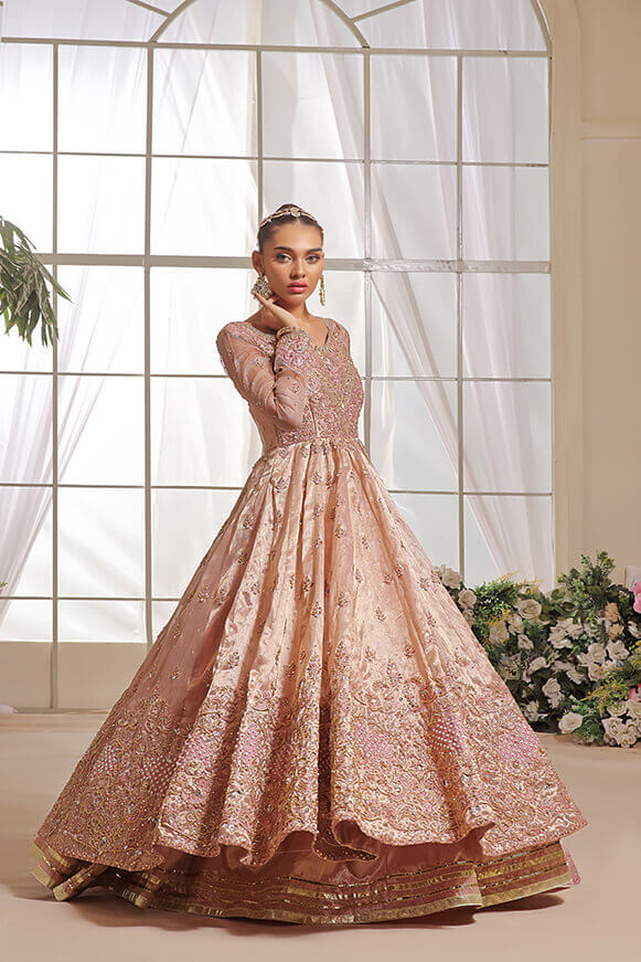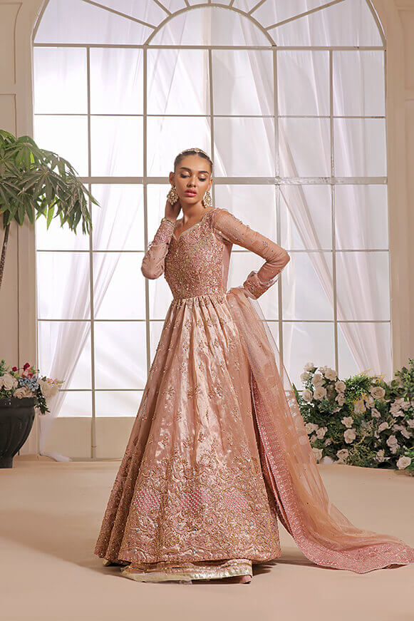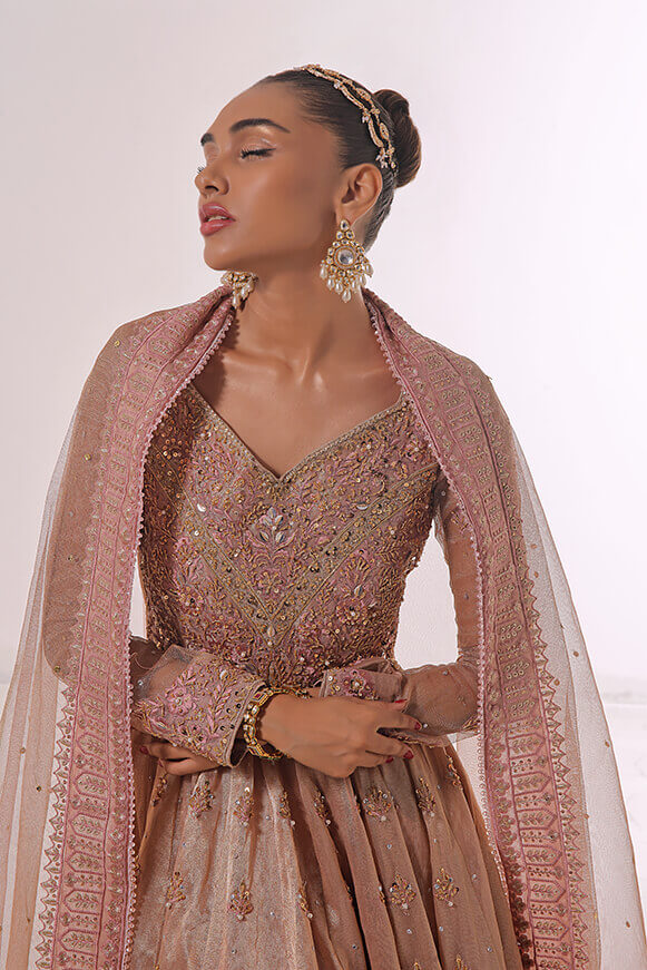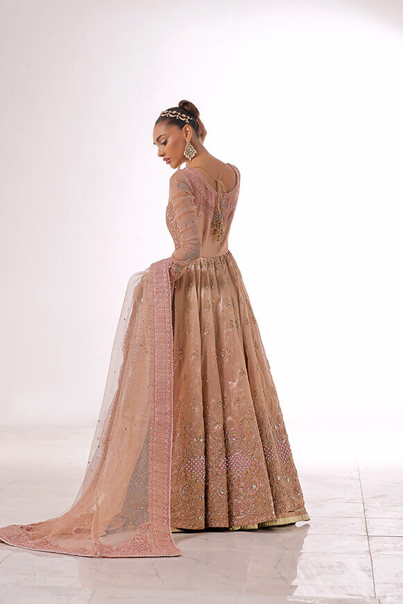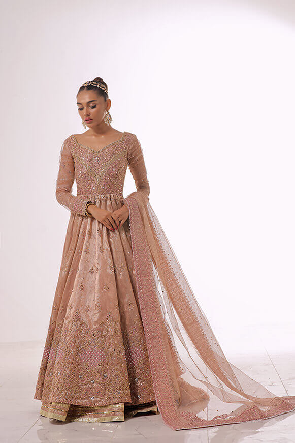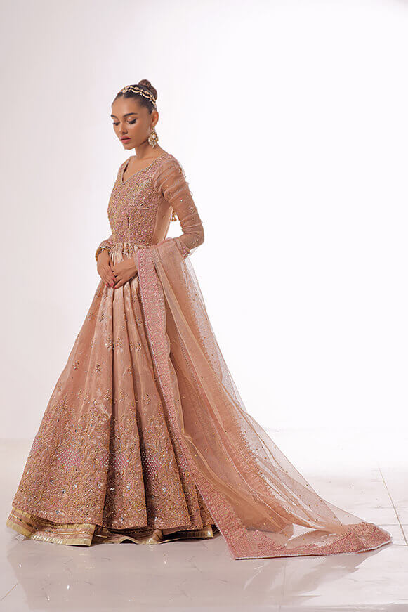 A beautifully hand crafted Pishwas with detailed handwork on borders & on bodice with 10 yards flare. Paired with