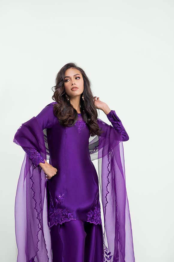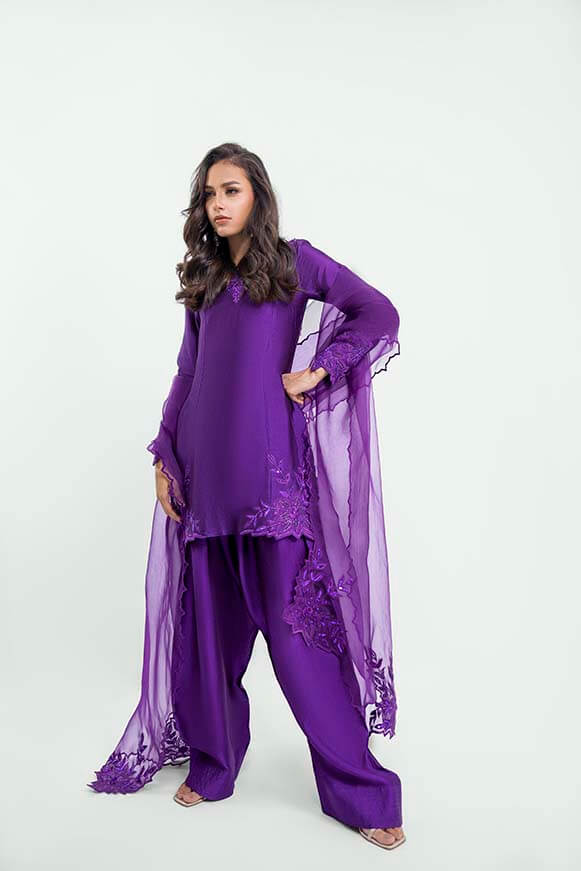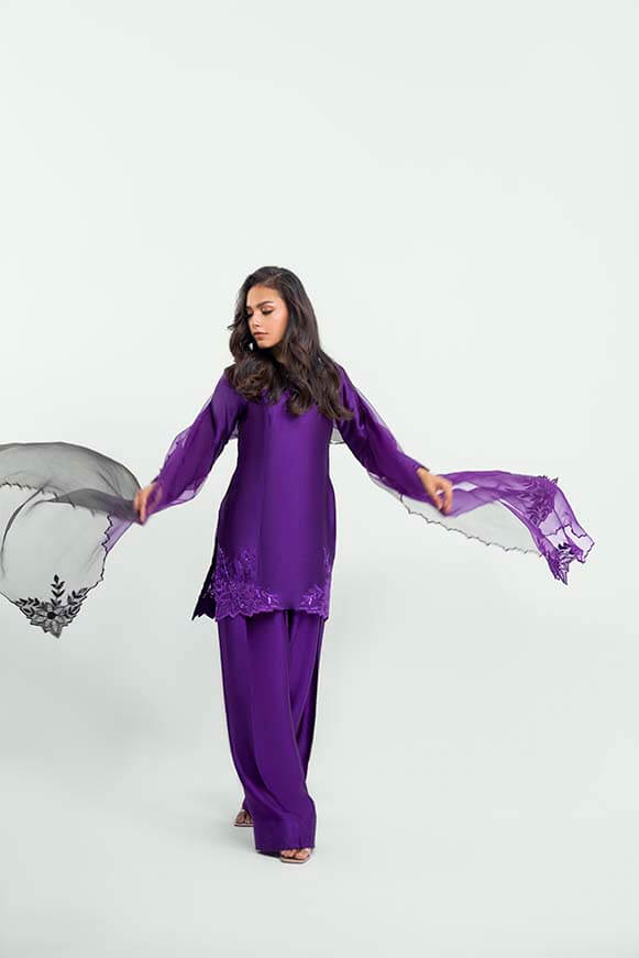 Short shirt with applique work on neck line and daman with stones and crystals been used