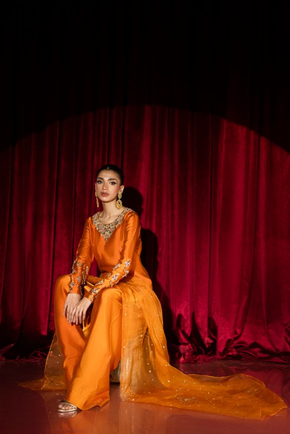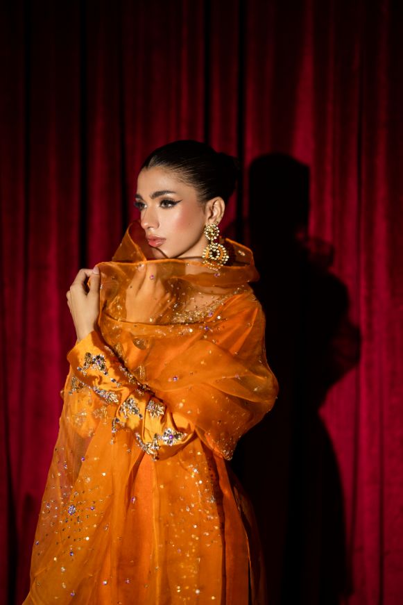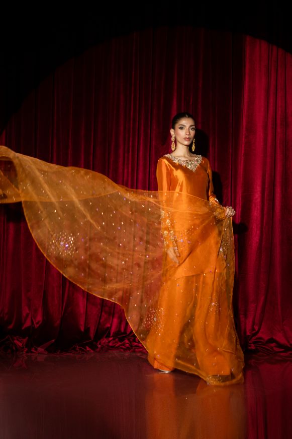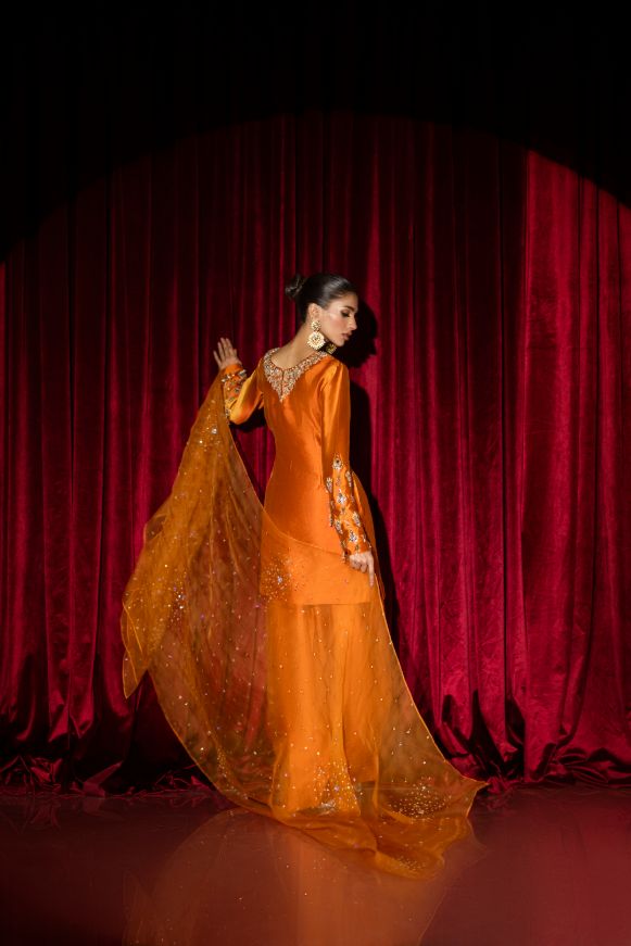This vibrant burnt orange short shirt with shalwar adorned with beautiful Swarovski stones and jewel stones and kora dabka on neckline and sleeves paired with pure katan organza dupatta with sequins and Swarovski stones.