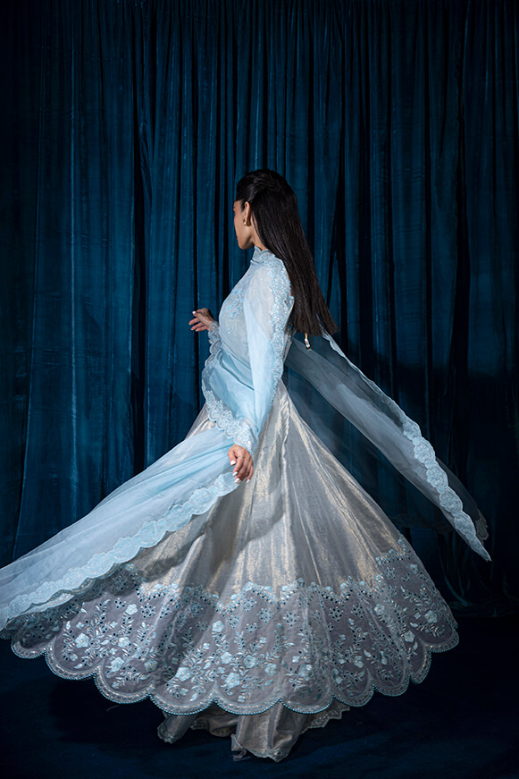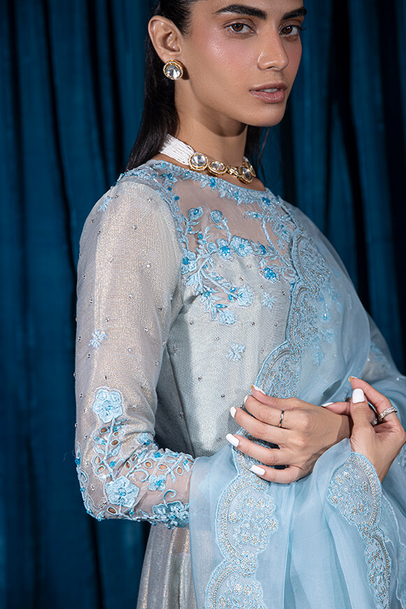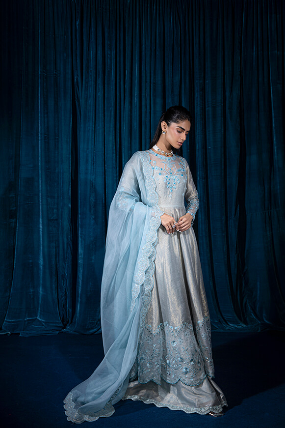 Mysori pishwas with beautiful organza patch work embellished with stones crystals and pearls paired with 3 yards of organza dupatta and four side borders.