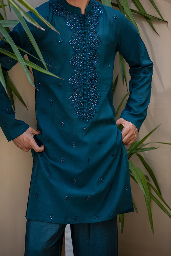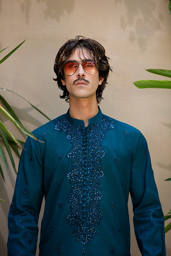 Step into a realm of timeless elegance with our Khaddi cotton kurta, designed for the discerning gentleman. This exquisite piece features intricate adda work adorning the neckline and extending across the full kurta, showcasing a remarkable blend of…