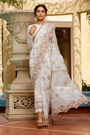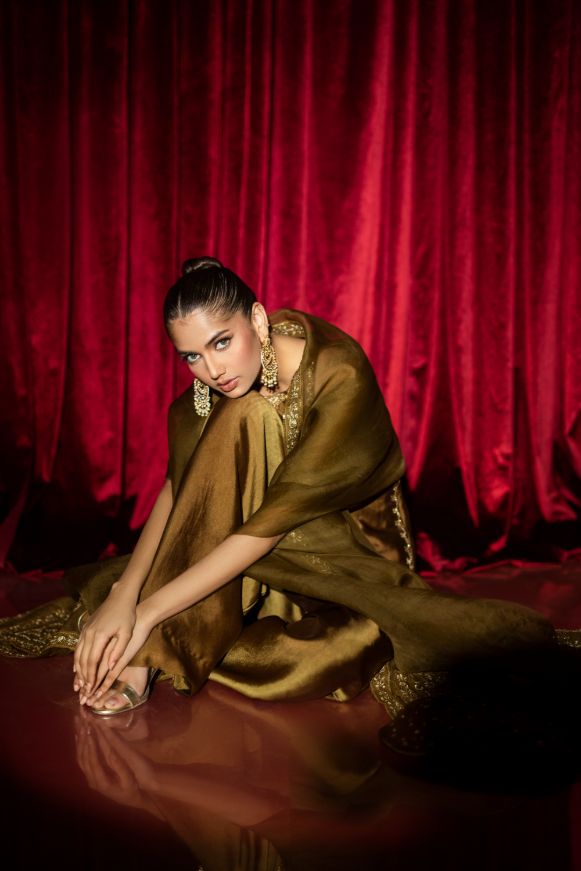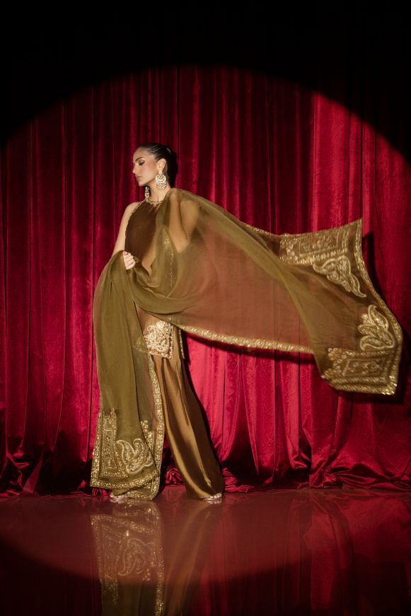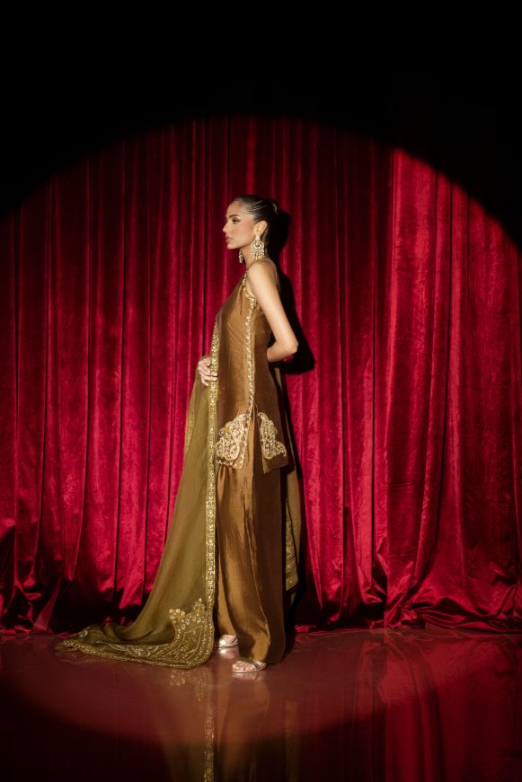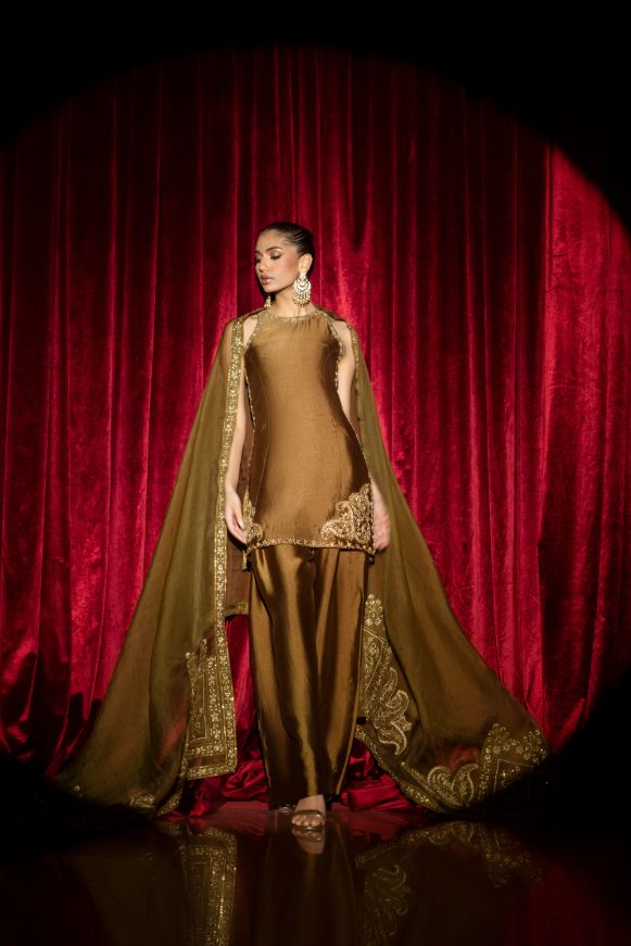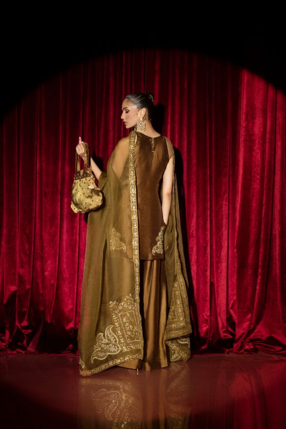 Pure sheesha silk short shirt and shalwar with work techniques of kora dabka naqshi all over the shirt paired with pure katan organza dupatta four side borders and bunches on pallu.