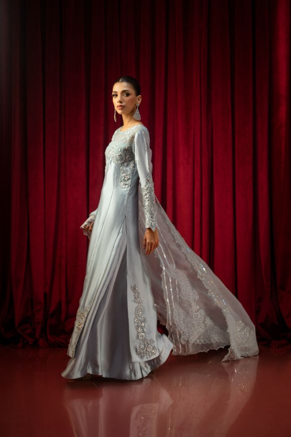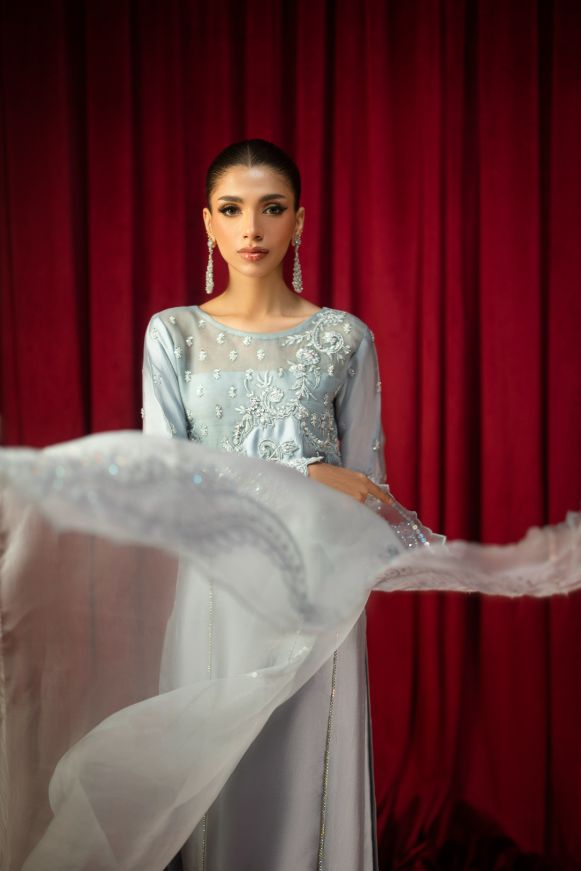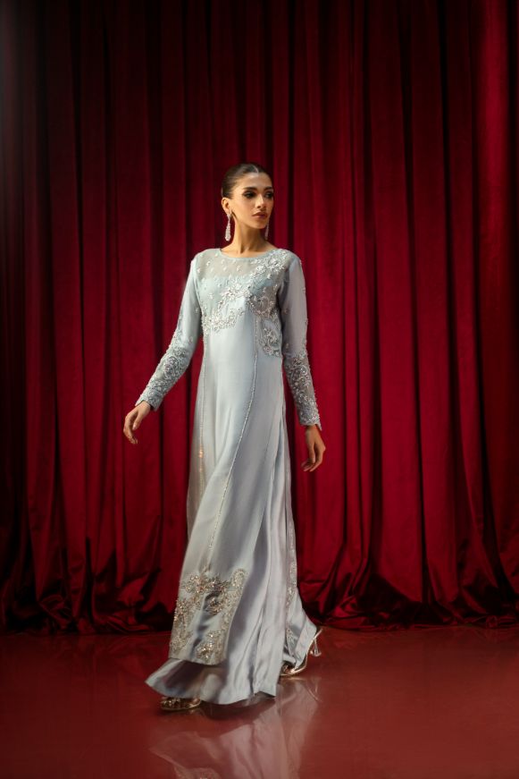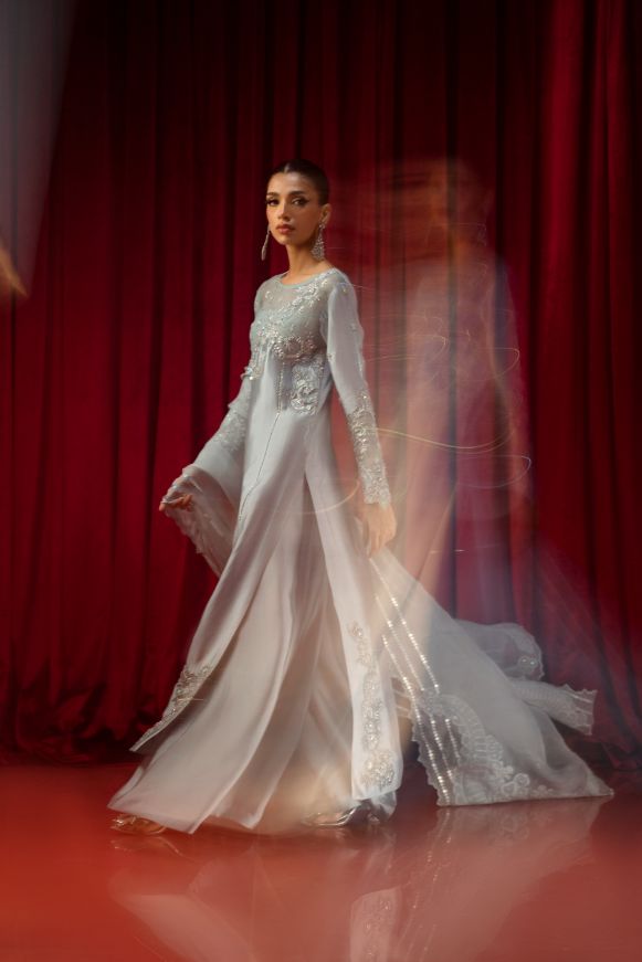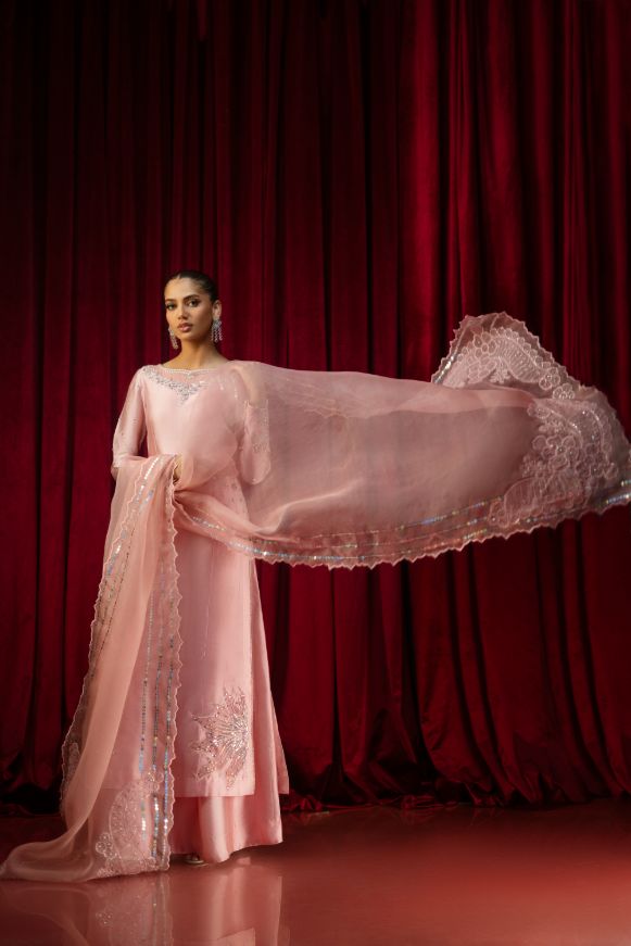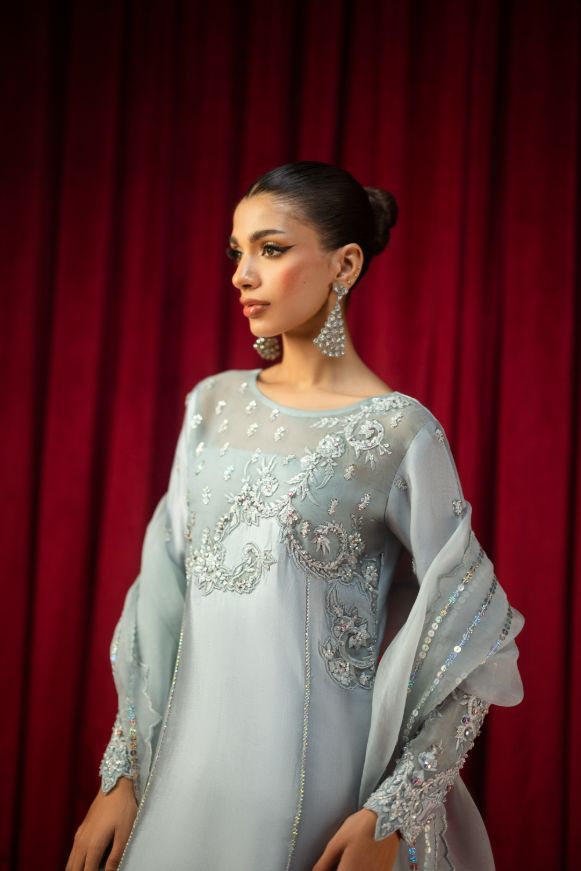 This A line long shirt with the detailed and intricate handwork on front neck line and daman and on sleeves is adorned with Swarovski stones and sequins and pearls paired with pure organza dupatta and plazo pants.