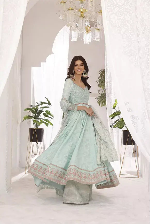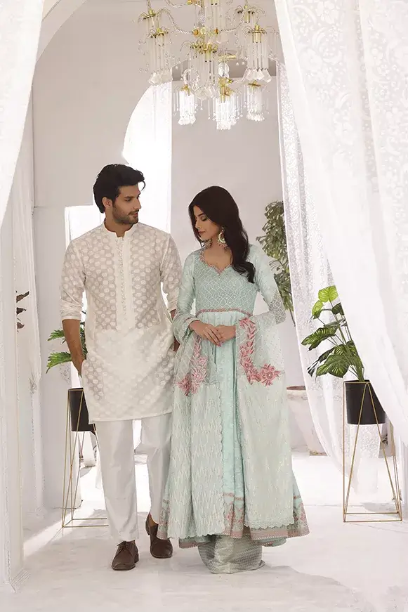 Silhouette pishwas on self khaddi adorned with delicate handwork. It comes with embroidered dupatta blended with organza and silk combination. Plazos are made on self texture.
