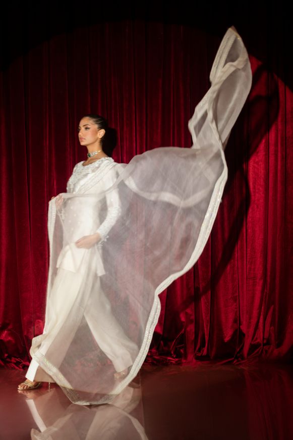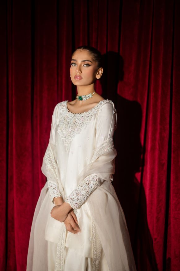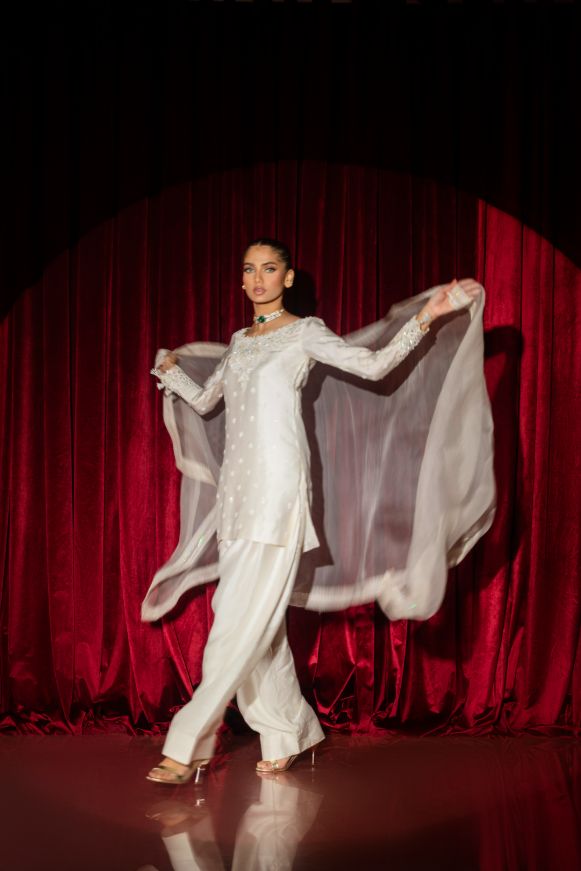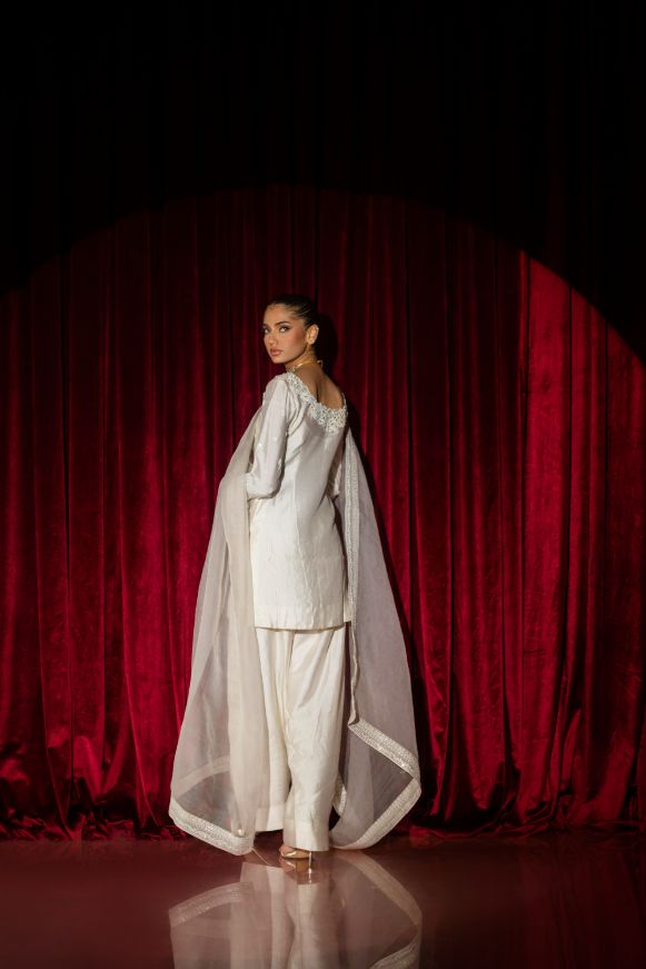 A classic short shirt with loose shalwar has the beautiful handmade neckline sleeves with intricate cutwork and small booties all in the shirt.
