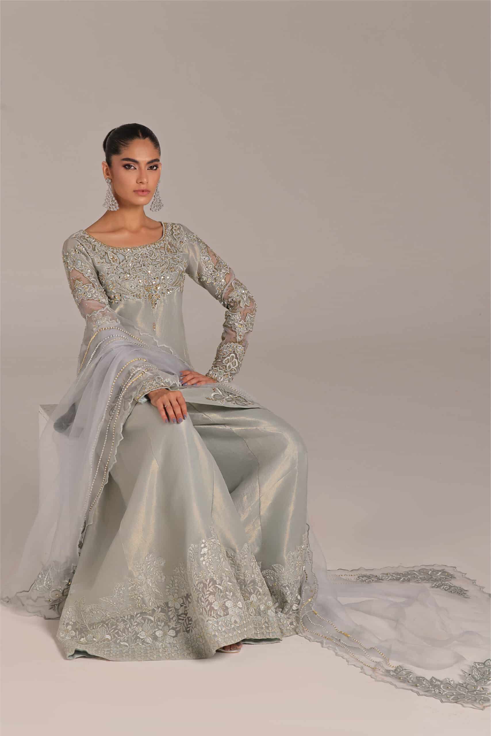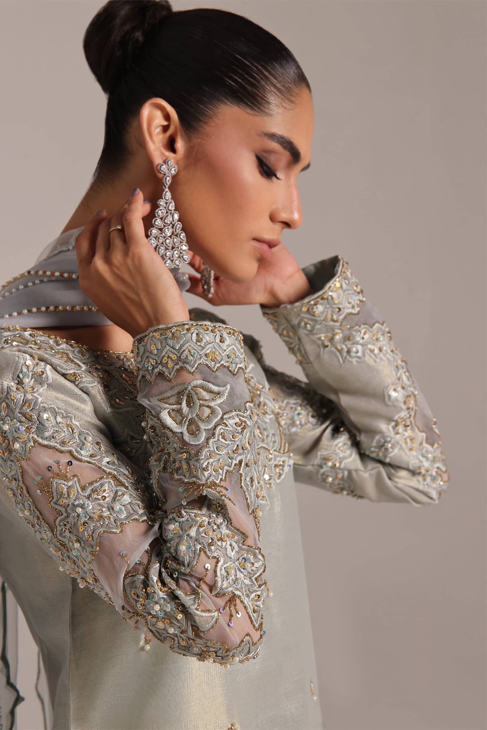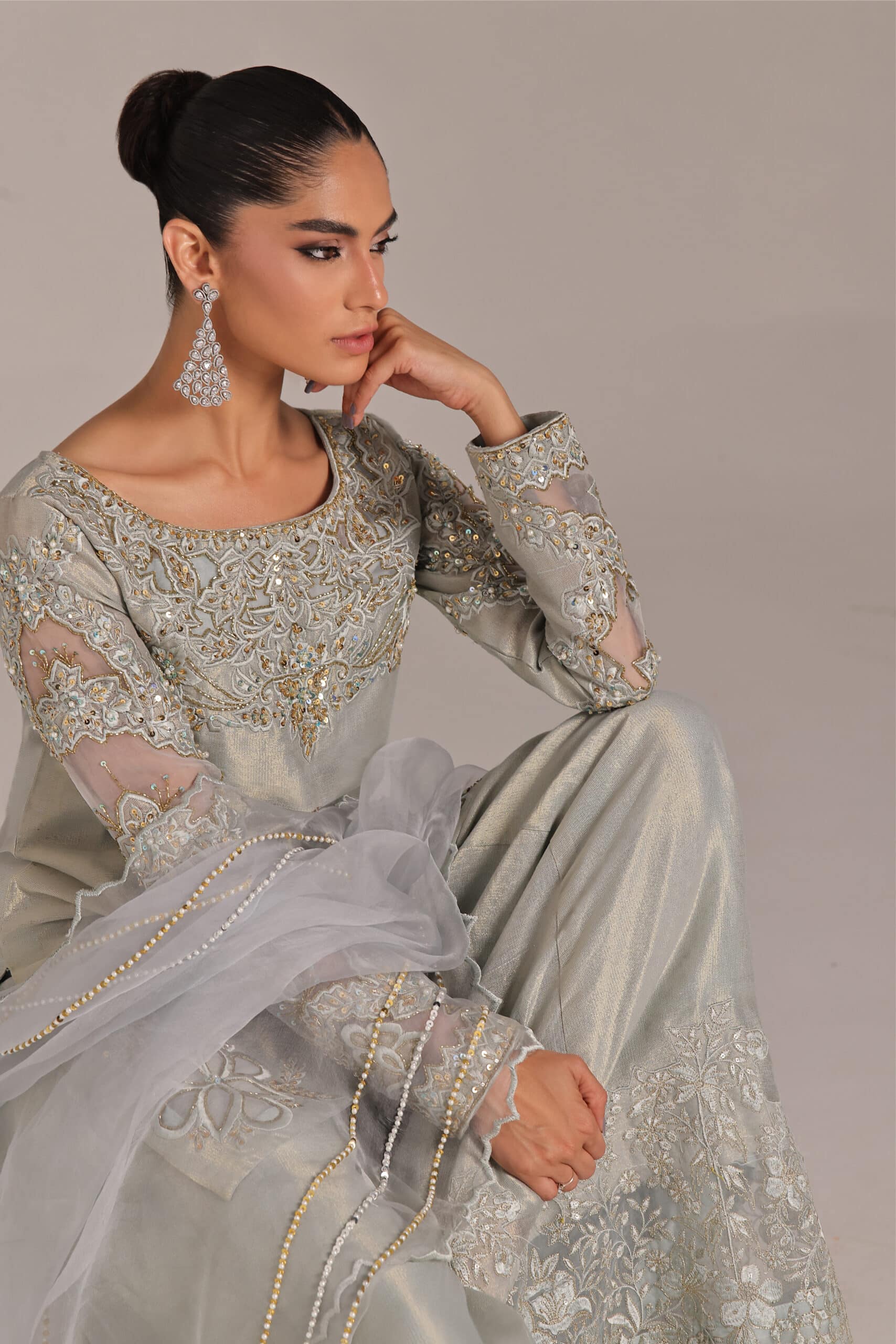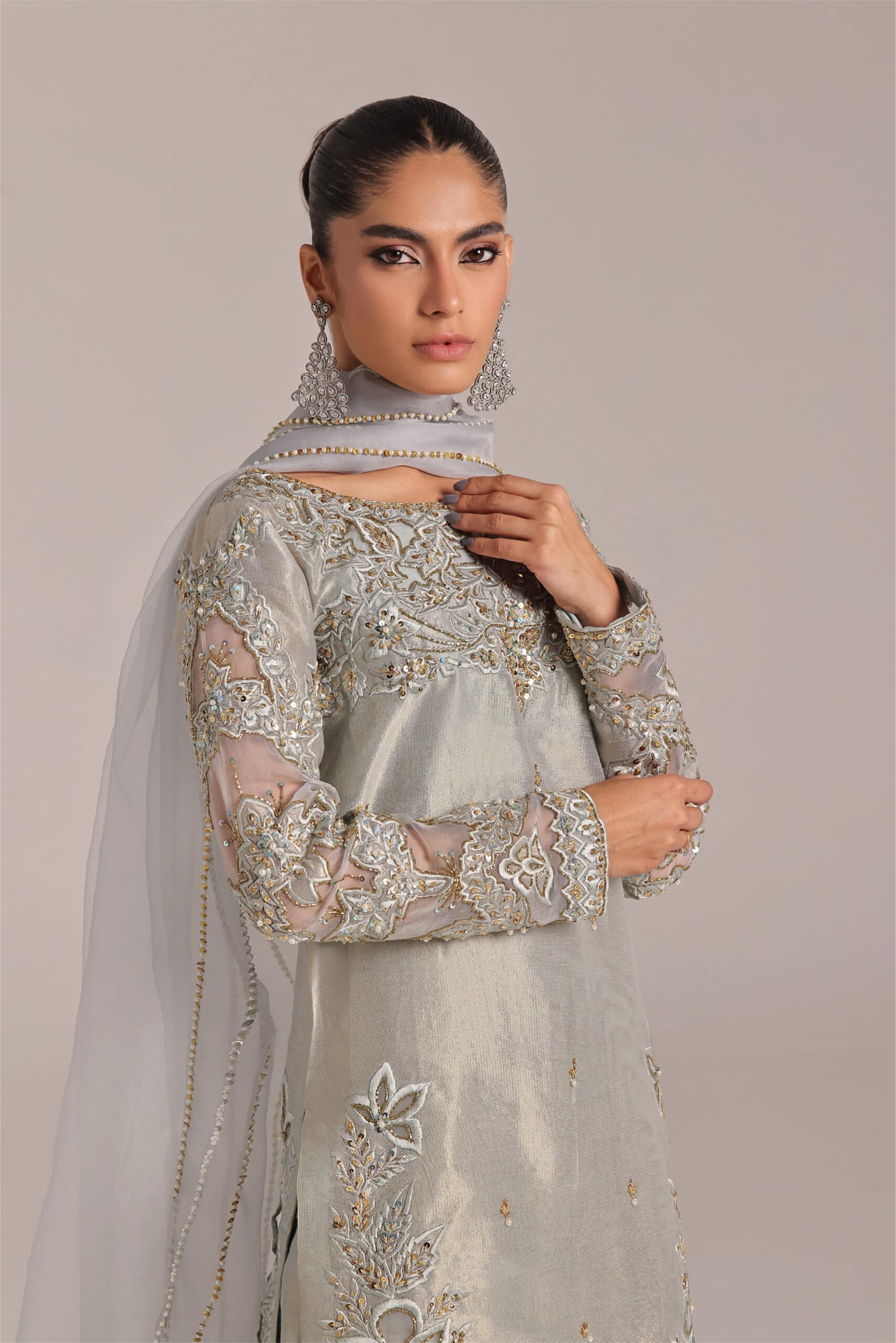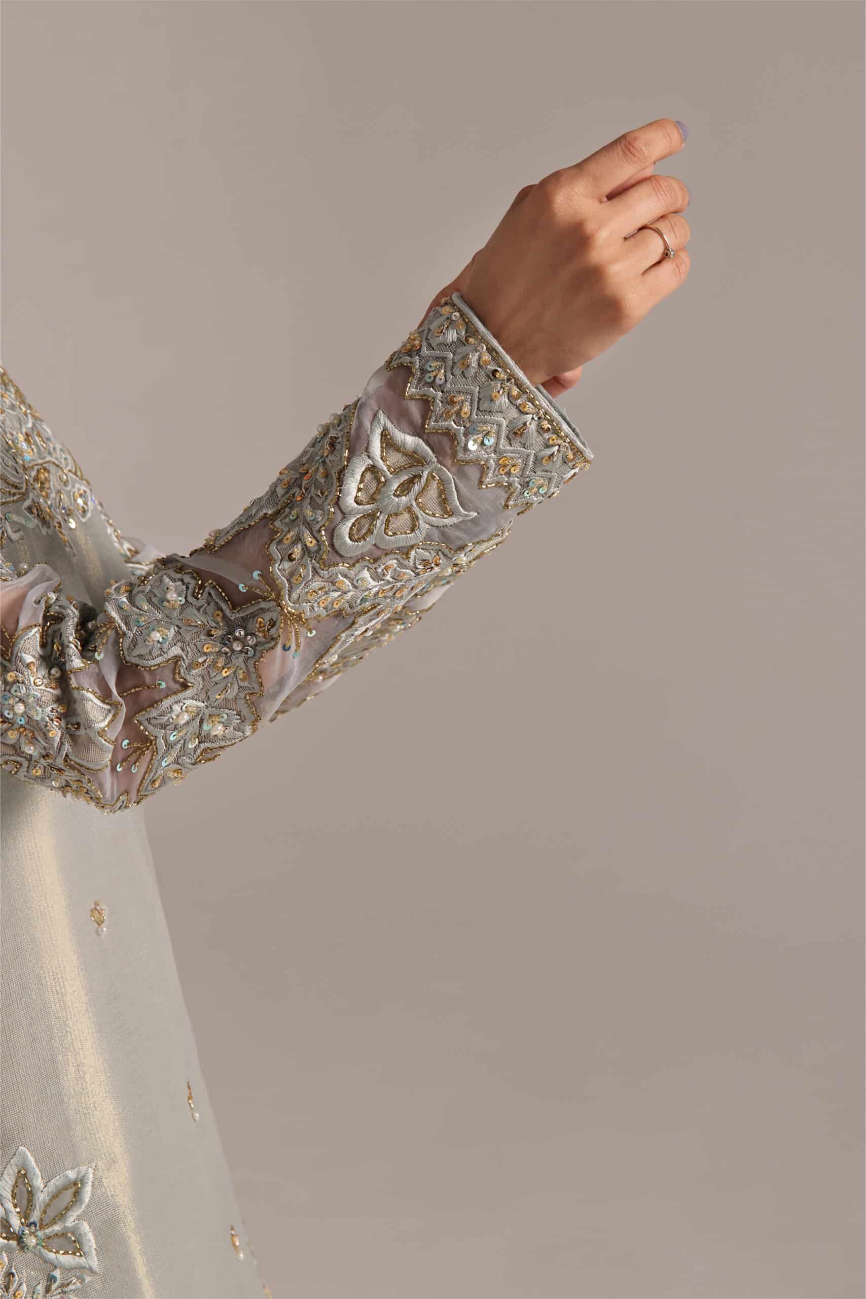 Detailed and intricate work on the front neck line and on sleeves with thread work and cutdana with pearls and beads and sequins paired with plazo pants 8 inches border on pants dupatta has sequence lines and bunches with scallops details