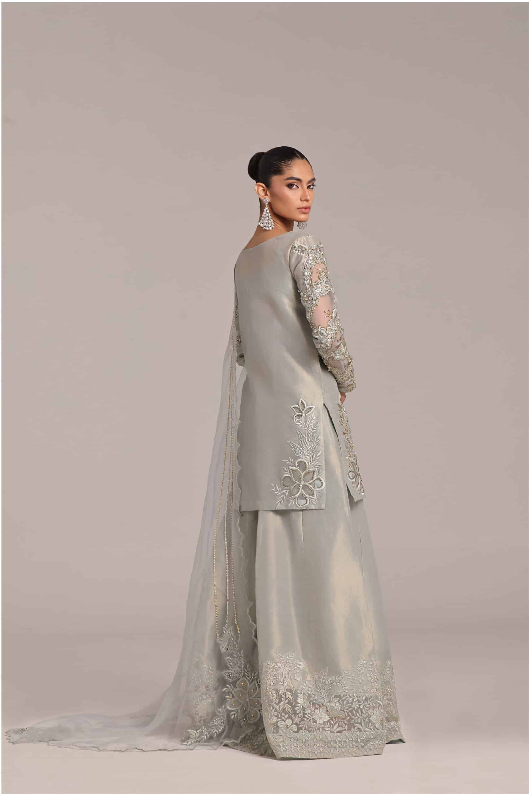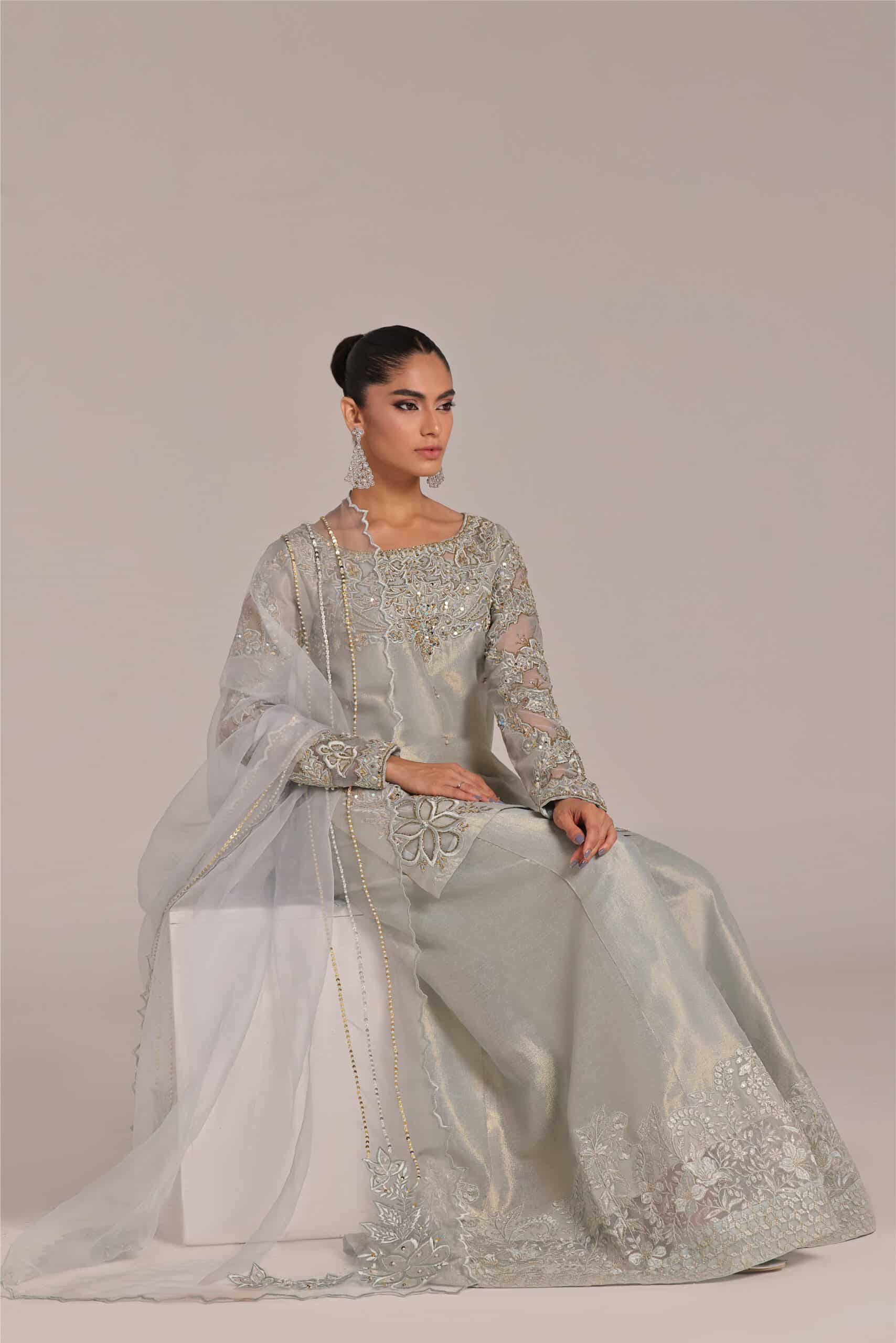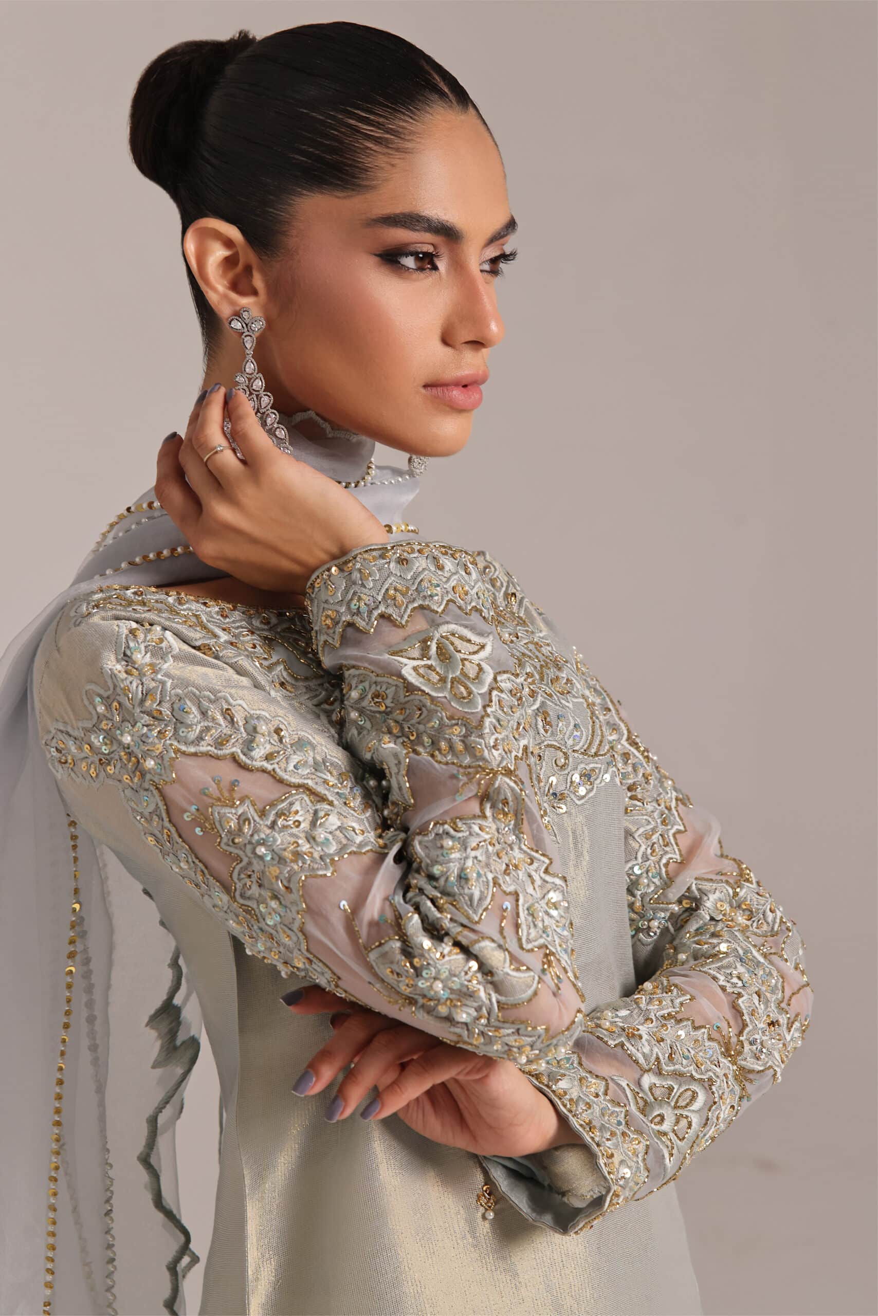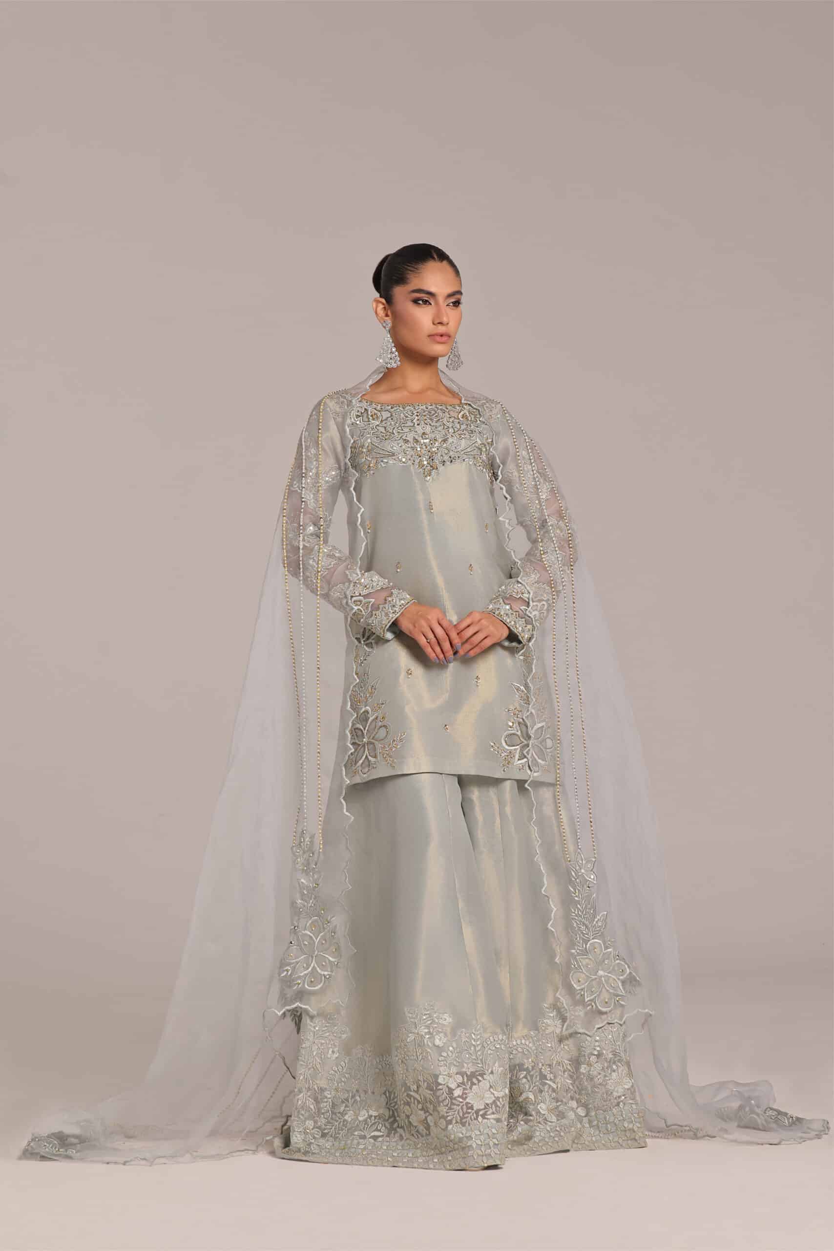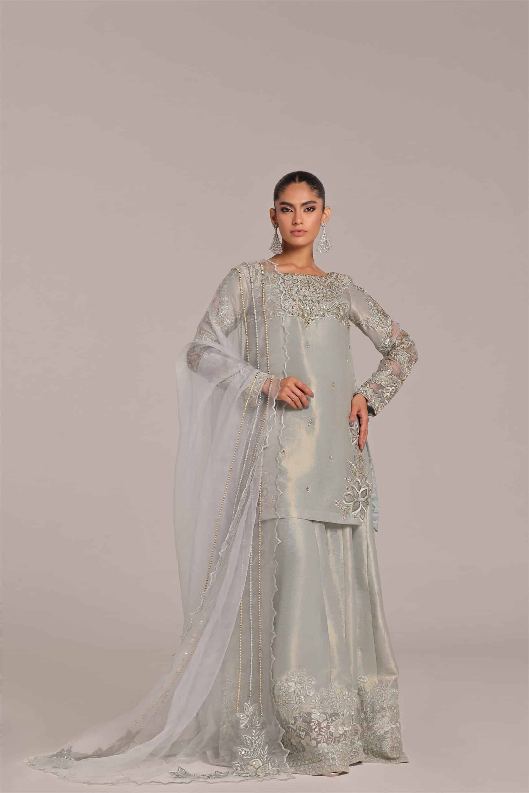 Detailed and intricate work on the front neck line and on sleeves with thread work and cutdana with pearls and beads and sequins paired with plazo pants 8 inches border on pants dupatta has sequence lines and bunches with scallops details