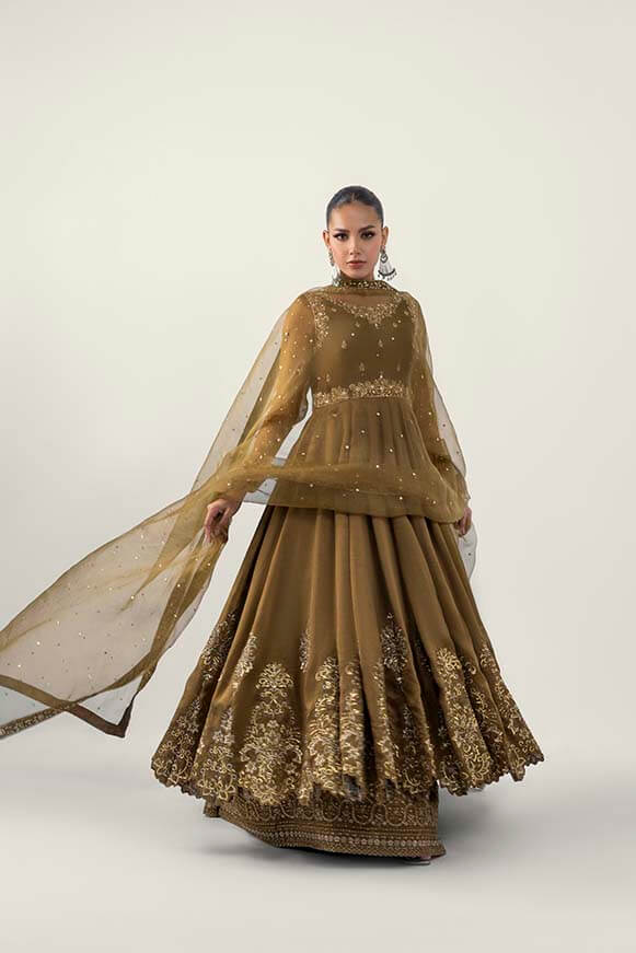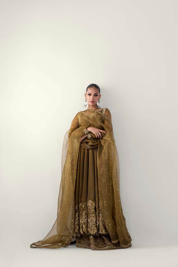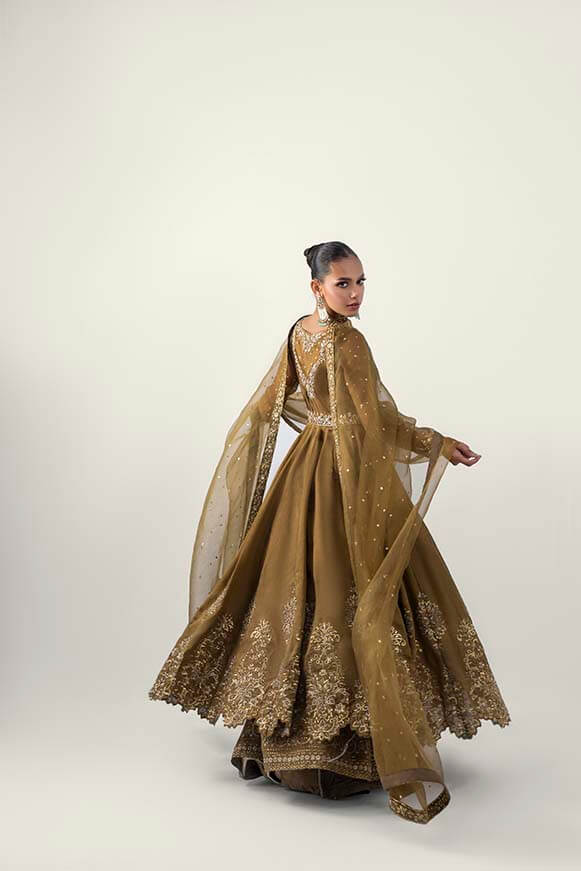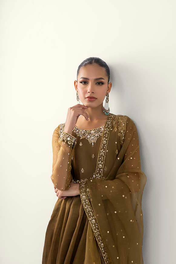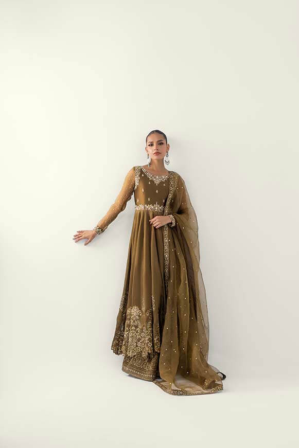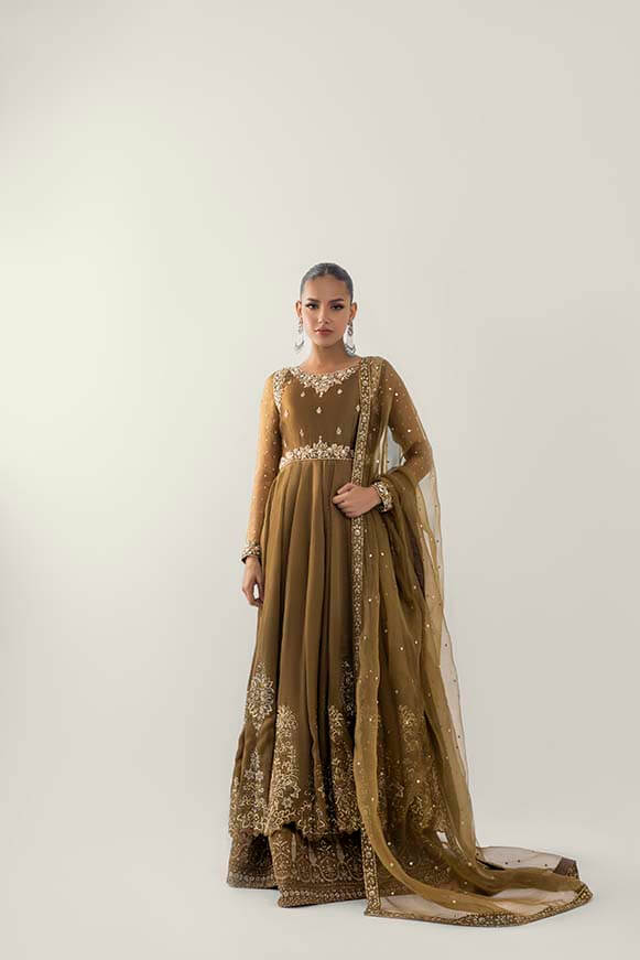 A beautiful mehndi colour pishwas zardoz work on neck line and sleeves and thread work on flare with sequence paired with plazos and pure organza dupatta