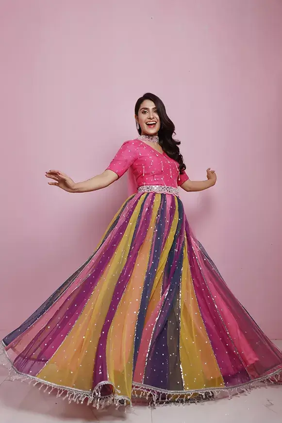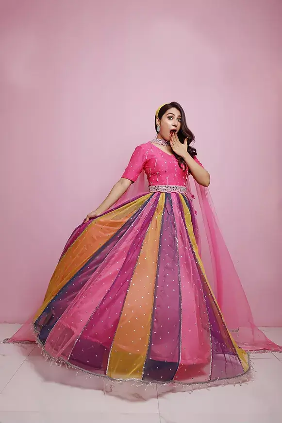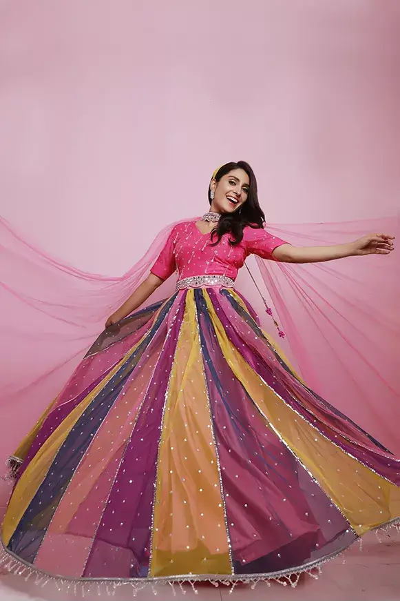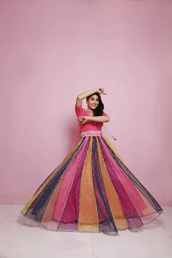 Multi colour choli on silk fabric paired multi layered lehnga of same fabric. Choli and lehnga are fully embroidered with hand work. It is inspired by madhuri dixit costume from tezaab. Ayezah khan has taken it to next level in her outstanding play laapata. It comes with net dupatta.