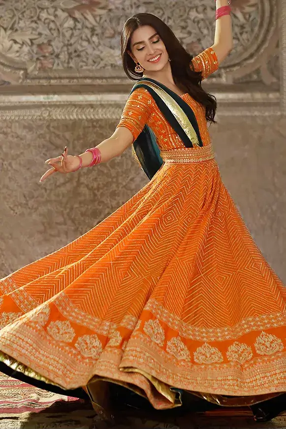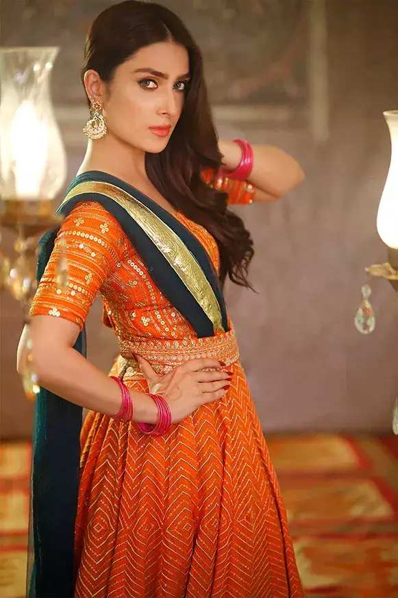 Ayezah khan has blown the audiences with Noori look from Superstar in her play laapata. We created this beautiful outfit on silk. It is a double layered fully embroidered lehnga choli with thread and sequence work. It is paired with Indian goata net dupatta.