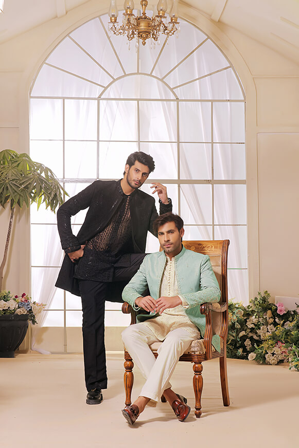 A detailed embroidered long Prince Coat with the details of Stone Sequins & Dabka work on Sleeves + Collar paired