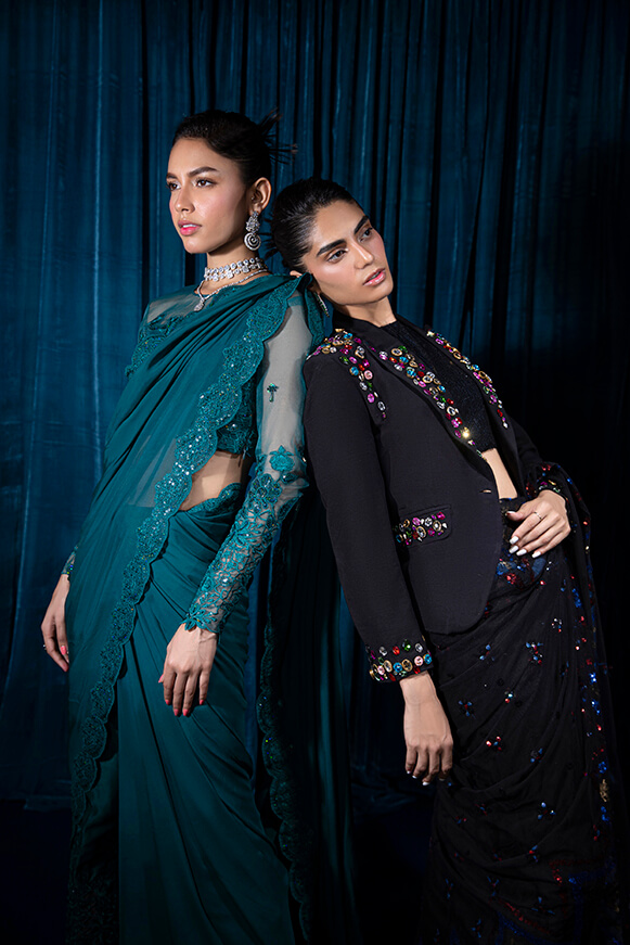 An extravagant vista of our regalia collection, sleekness & artistry merged together. Tailored to perfection, net saree is a picturesque statement piece. Coat is embellished with our very best selection of premium stones to make it stand out.