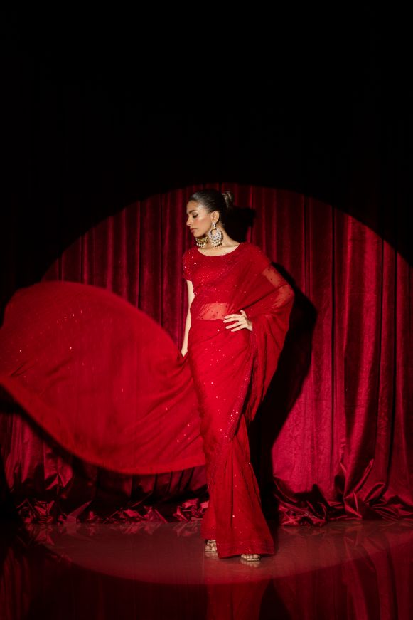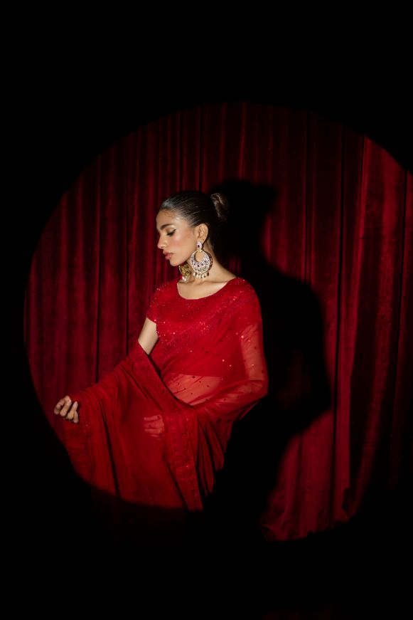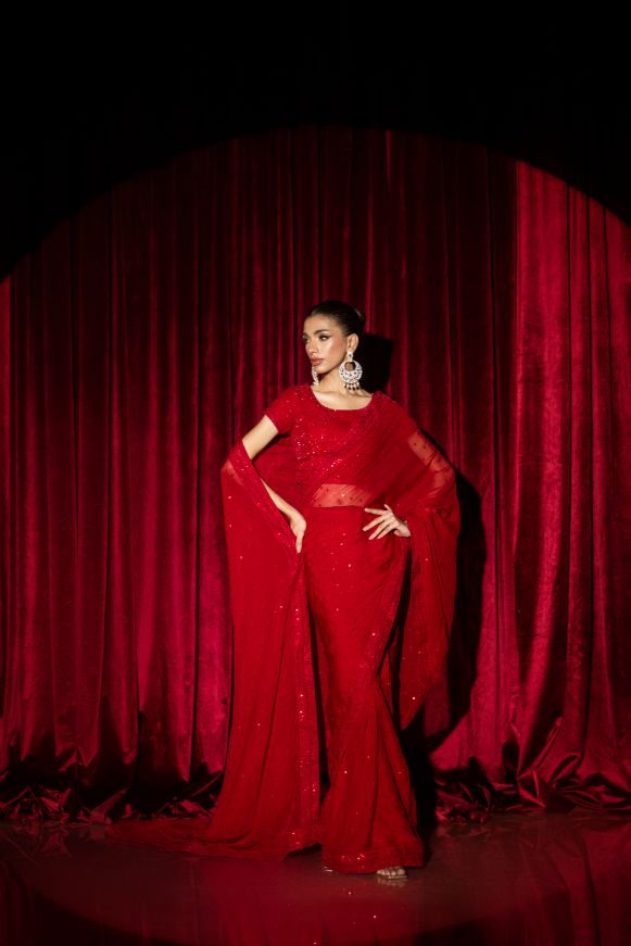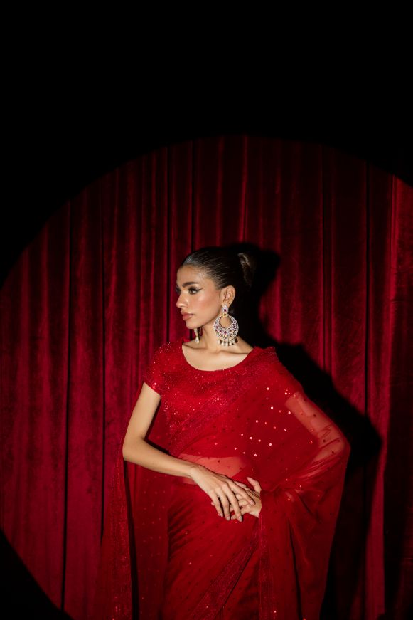 This delicate chiffon saree in deep red color is adorned with cut-dana sequins crystals and thread work blouse is completely hand made.