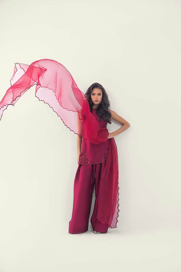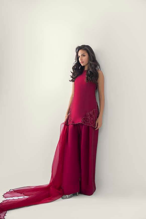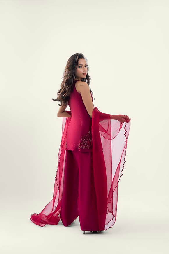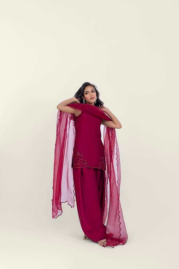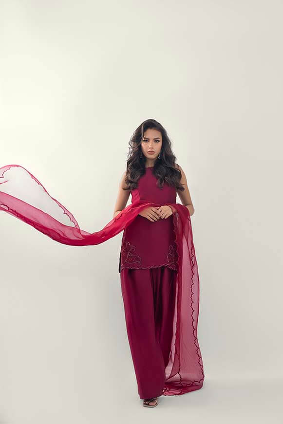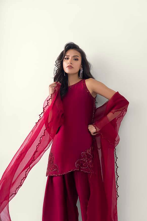 Halter neck Short shirt with farshi shalwar zardozi work on the shirt daman and on sides paired with pure organza dupatta