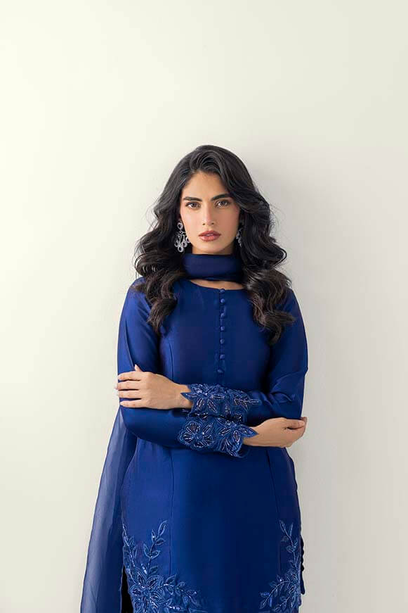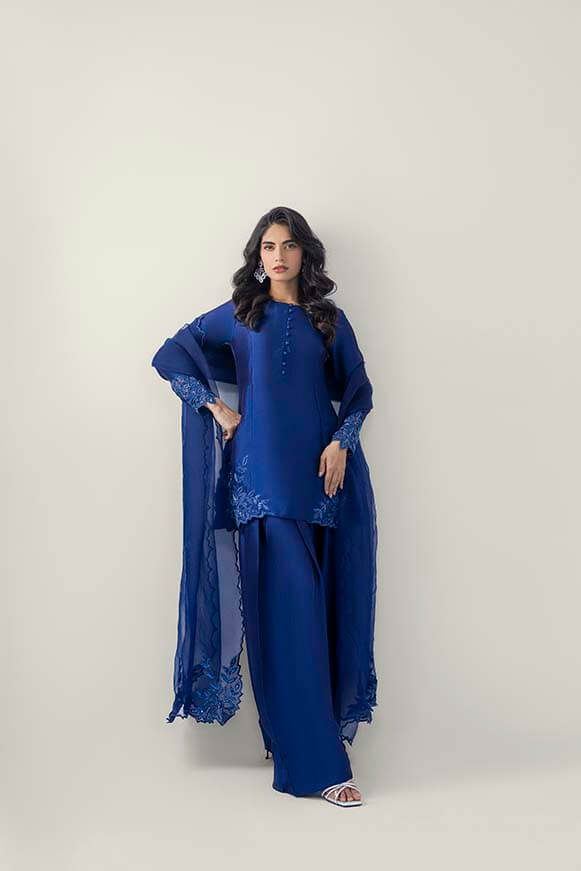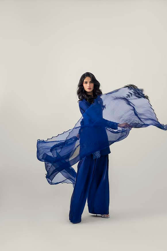 Applique work technique has been used on front daman and on sleeves paired with pure organza dupatta