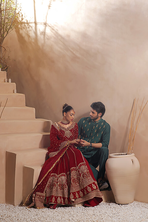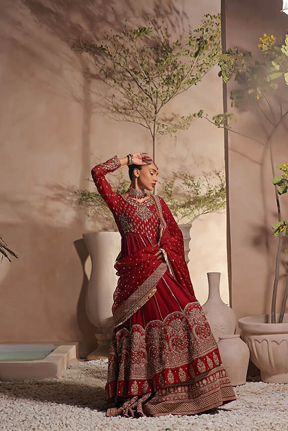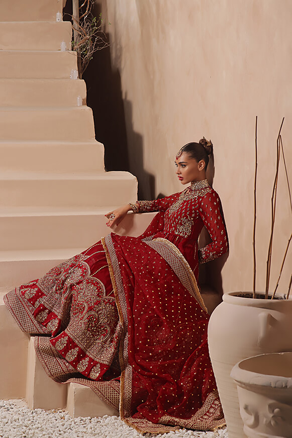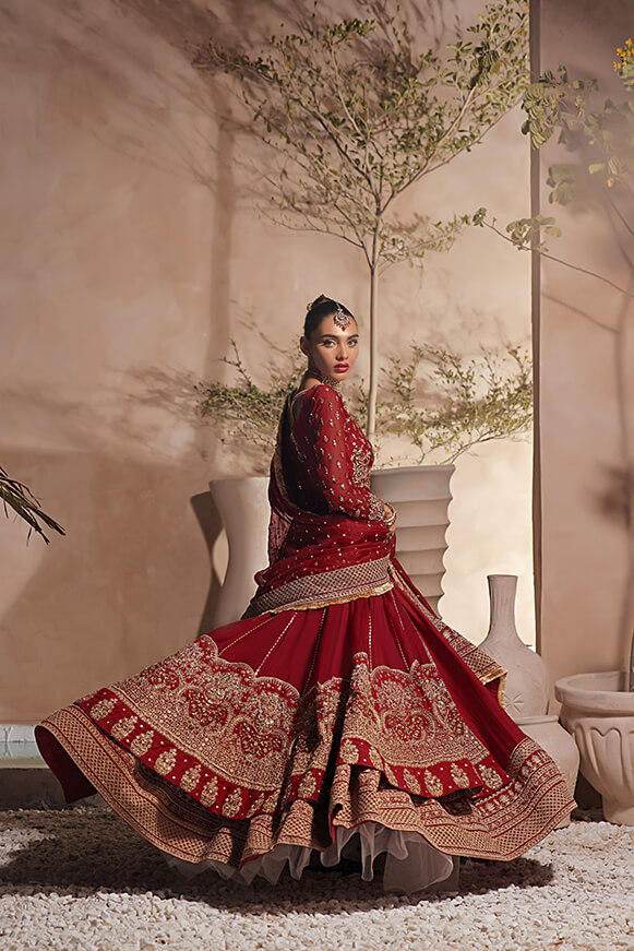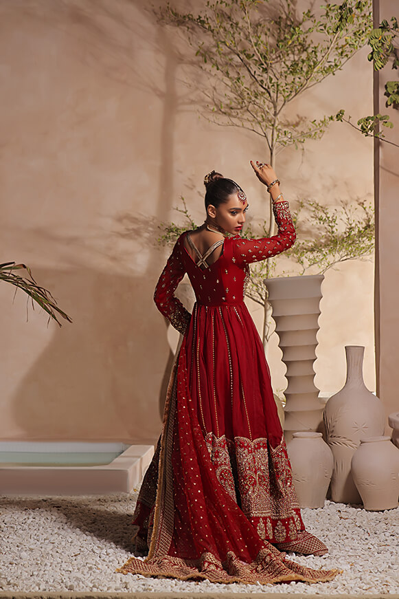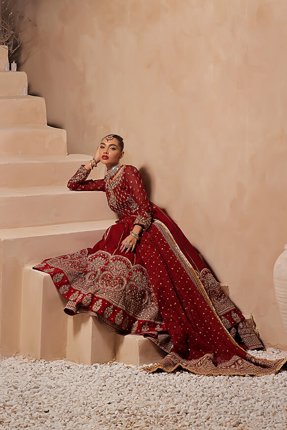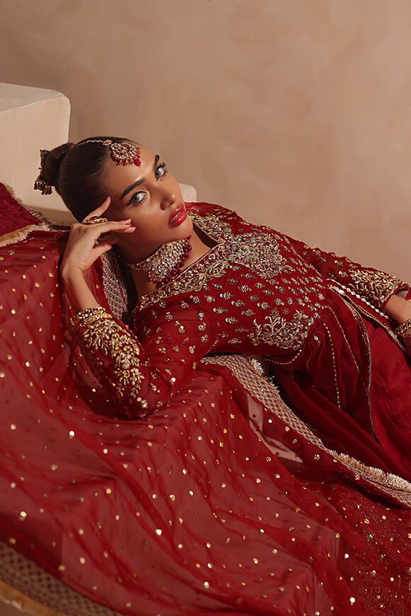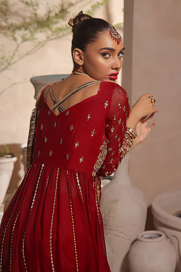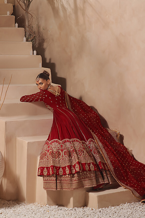 A beautiful scarlet red outfit with gold thread work and handwork on bodice and sleeves paired with 4 yards of