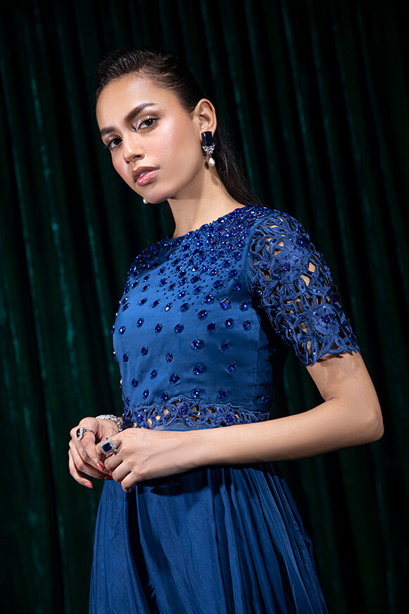Solana features a sleek fusion frame, fabricated using silk base, made rich with premium stones & cutwork. Cutwork sleeves render the outfit a very exquisite look, Paired with pants.