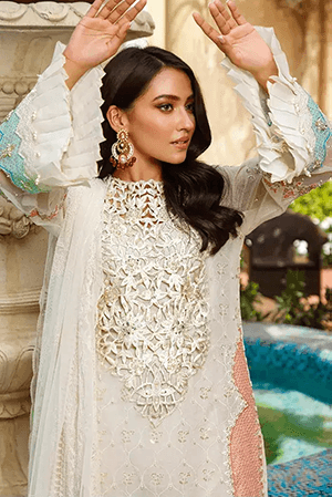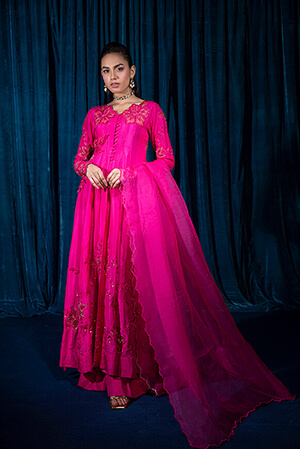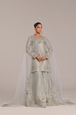 The Surkh is a modern ode to timeless tradition. This classic short silk shirt carries the weight of heritage in every stitch, adorned with intricate handwork of kora, dabka, naqshi, and tikki stones that shimmer with understated elegance. Paired with a heavily embellished gharara, the ensemble commands attention without losing its…