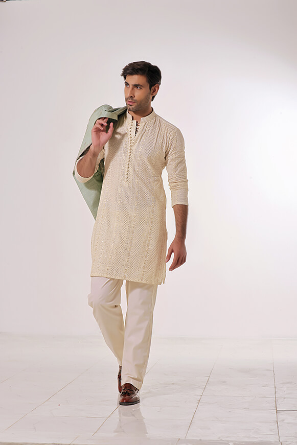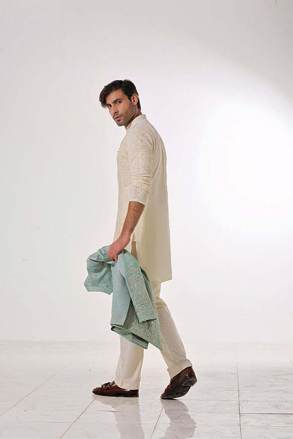 paired with cream colored fully embroidered Kurta & Raw Silk trouser.